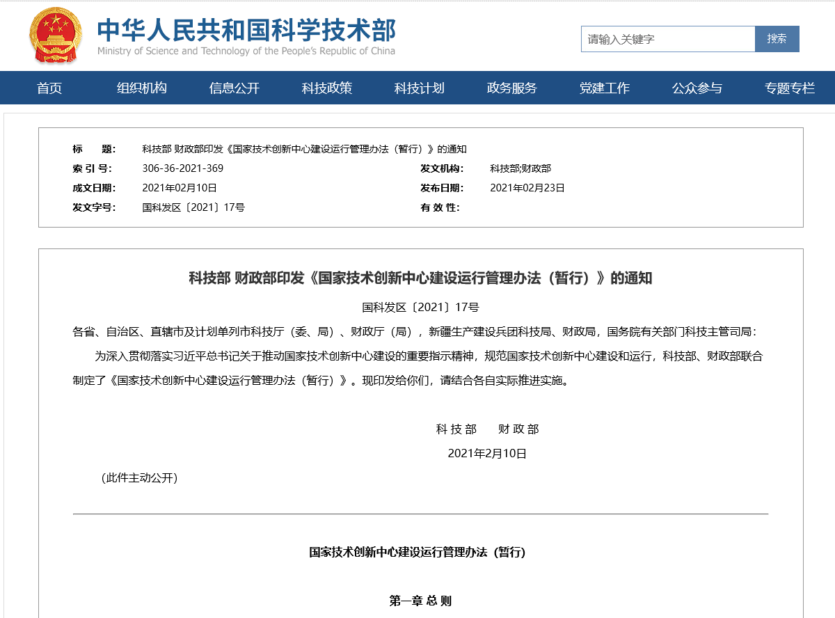 为深入贯彻落实习近平总书记关于推动国家技术创新中心建设的重要指示精神,规范国家技术创新中心建设和运行,科技部、财政部联合制定了《国家技术创新中心建设运行管理办法(暂行)》。现印发给你们,请结合各自实际推进实施。